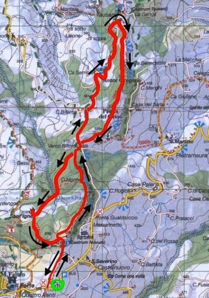 Itinerario nella cosiddetta Cresta dei Tausani, ovvero le Piccole Dolomiti della Valmarecchia, che inizia in prossimità di San Leo (589), sale al Monte San Severino (658 m), scende al Borgo di Tausano (445 m) per risalire verso il Monte Gregorio (560 m) e i torrioni della Penna del Gesso (578 m), poi Monastero di Sant’Igne e San Leo. Lasciate le auto (o il pullman) al parcheggio in prossimità del cimitero di San Leo si imbocca il sentiero che lo costeggia e che con breve salita porta ad un crocicchio da cui si continua a salire verso il panoramico Monte San Severino. Di qui inizia la discesa che porta al valico della Biforca (alcuni punti un po’ ripidi) e si scende poi dolcemente su uno stradello fino al borgo di Tausano. Da Tausano si comincia a salire verso il monte Gregorio e la Penna del Gesso fino a ridiscendere al valico della Biforca; in breve si raggiunge il Convento Francescano di Sant’Igne, oggi non più abitato e, purtroppo, in non perfetto stato di conservazione (visita alla Chiesa e al chiostro). Dopo la visita al Convento si sale per un sentiero in mezzo al bosco per ritornare al punto di partenza.