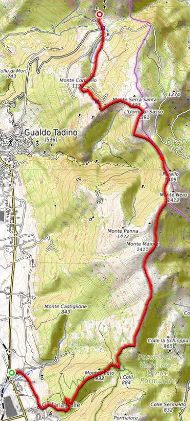 Dalla località di Gaifana (480 m) si procede in direzione del paesino di Colle, da dove si inizia a salire fino ad incontrare, dopo circa 5 km, il Sentiero Italia all’altezza del Trivio di Luticchio (860 m). Si continua a salire passando sotto la cima di Monte Nero e, aggirando la cima del Monte Serrasanta, per arrivare all’omonimo eremo (1340 m). Si prosegue in discesa fino in località Valsorda dove si trova il rifugio di Monte Maggio (1004 m).