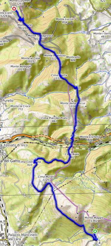 Dal Rifugio Monte Maggio ci si tiene sotto la dorsale che segna il confine tra Umbria e Marche passando sotto il Monte Maggio e il Monte le Senate, in una zona caratterizzata da numerose grotte. Sotto Cima Mutali si disegna un ampio arco che ne aggira la sommità riprendendo il percorso verso nord fino al valico stradale di Fossato. Si tocca poi la Cime Filetta a quota 1120 metri, il Monte Pratiozzo a 1126 m e il Monte Testagrossa a 1175 m da cui si scende all’abitato di Val di Ranco.