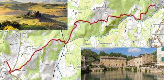 Un pezzo della splendida Via Francigena attraverso le famose Crete Senesi, le abbazie, i castelli e le colline ricoperte da vigneti. Partendo da Bagno Vignoni, stazione termale fin dal Medioevo, caratterizzato dai favolosi bagni termali proprio nel centro del paese, si raggiunge il castello di Ripa d’Orcia, dal quale si ammira il magnifico panorama sul fiume Orcia. Si prosegue poi attraversando la regione delle Crete, da dove si può godere di vedute incredibilmente suggestive. Il cammino continua attraversando i famosi vigneti del Brunello per raggiungere l’Abbazia benedettina di Sant’Antimo, una delle più suggestive abbazie della Toscana, fondata probabilmente da Carlo Magno.