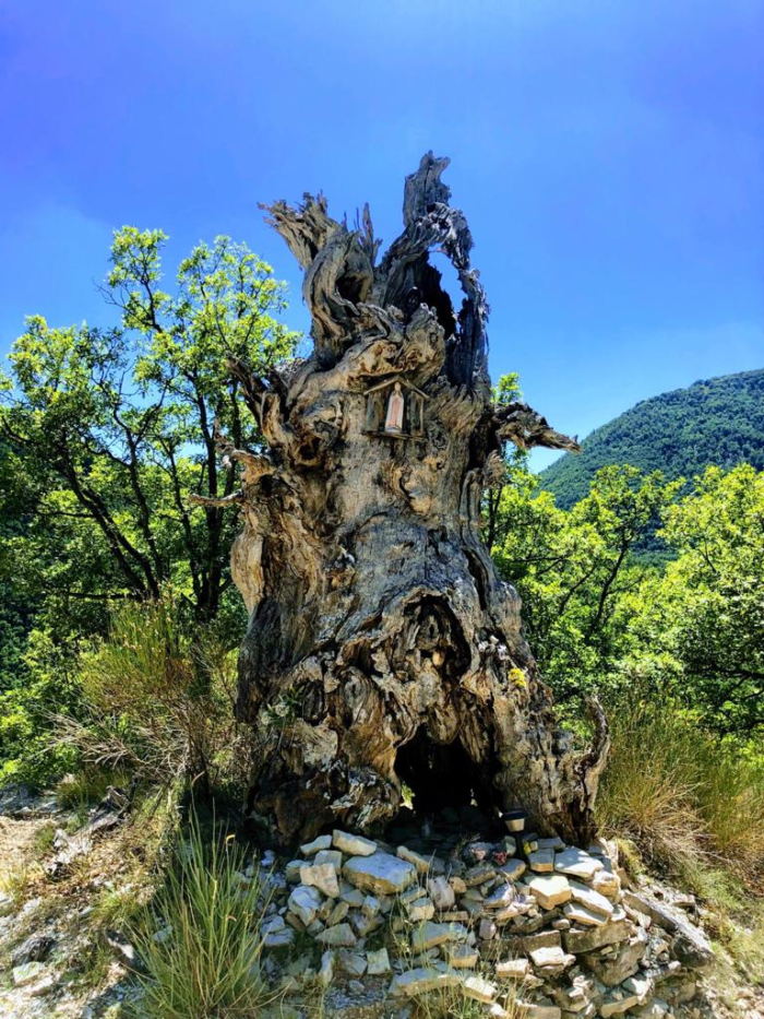 Fatto rifornimento di acqua alla fonte presso la chiesa, si prende a salire sul versante orientale del M.te Meraviglia per una ripida carrabile attraversando boschi aperti costituiti prevalentemente da roverella e carpino nero. L’itinerario prosegue allo scoperto e, verso est, si possono osservare l’abitato di Valdonica e i M.ti Torrato ed Alvagnano; a sud i fitti boschi di M.te Pizzo e del Fosso del Buco. L’ascesa si fa più dolce proseguendo verso Casali Tetella (1168 m). Da qui, svoltando decisamente a destra direzione nord, inizia la salita piuttosto ripida del versante sud del M.te Meraviglia. Raggiunta la sommità (1392 m) si avrà la possibilità di ammirare un incantevole panorama con una bellissima vista su Cascia. Doveroso scattare foto e, dopo un meritato riposo, si ritorna, per lo stesso percorso usato per raggiungere la cima, a Casali Tetella. Da qui si imbocca, in salita, una mulattiera delimitata dapprima da siepi di acero campestre e, più avanti, da faggi integrata da muretti a secco. Ultimata l’ascesa, da F.ca Tetella (1280 m) si potrà osservare l’ampia vallata di Atino, di interesse storico ed archeologico; l’orizzonte è occupato dalla dorsale M.te Aspra-M.te Motola-M.te Civitella-M.te Coscerno a ovest; verso sud i monti di Leonessa e il Terminillo. Da F.ca Tetella si risalgono, direzione sud est, le ampie praterie della dorsale nord ovest del M.te Pizzo (1438 m). Una volta raggiunta la cima, punto più elevato dell’ escursione, inizia la seconda parte dell’escursione. Si scende in direzione sud est fino a raggiungere la F.te Le Vaglie (1140 m), all’ombra di un acero napoletano e di un cerro ci si ristora prima di inoltrarsi per la carrabile nel Fosso del Buco. Percorsi, in discesa, circa due chilometri di fondovalle la carrabile torna a salire fino alla Mad.na della Quercia (969 m): una nicchia nel tronco del grande albero, ormai secco, ospita un’immagine sacra. Da qui ad Onelli la carrabile procede in piano per circa un chilometro tra querce, cespugli e siepi di acero campestre.