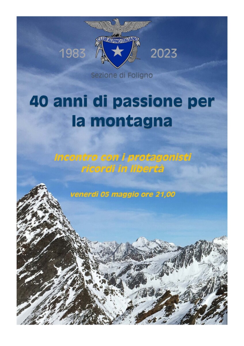 5 maggio 2023 Quaranta anni di passione per la montagna 5 maggio 2023 Quaranta anni di passione per la montagna 254 254 people viewed this event. Una frizzante serata per ricordare insieme i 40 anni della fondazione della sezione CAI di Foligno e rincontrare gli amici. Foto, ricordi in libertà e buffet per tutti Iscriviti all'evento Per iscriverti all'evento invia per email i tuoi dati foligno@cai.it Iscriviti usando webmail: Gmail / AOL / Yahoo / Outlook Data e ora - Location 42.96000081460086, 12.705140976686517 Tipologie di evento Eventi CAI Share With Friends Facebook Twitter Linkedin Xing Pinterest